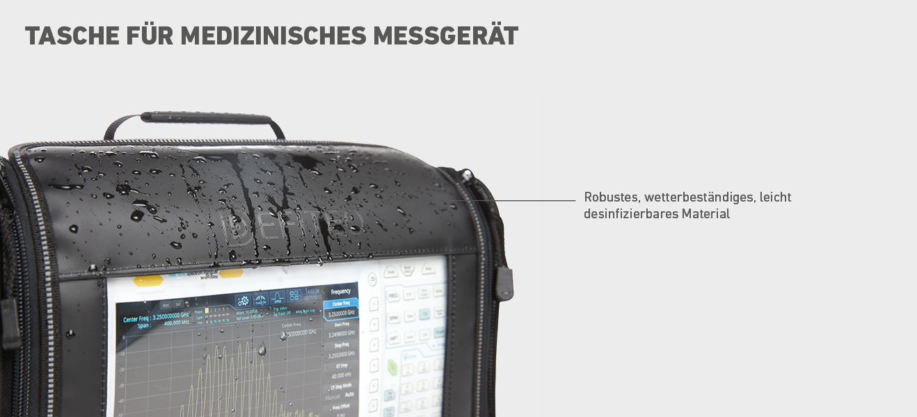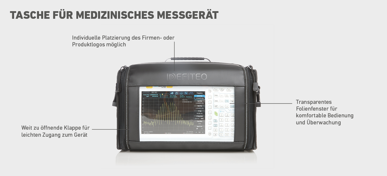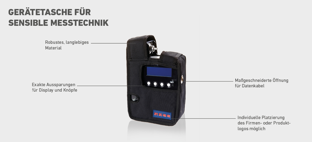 Ein häufiger Einsatzbereich für Spezialtaschen ist das Transportieren, Schützen und Bedienen von Messgeräten. Die Herausforderung ist hier, die häufig technisch sensiblen Geräte so einzupacken, dass die Mess- und Bedienfunktion nicht gestört bzw. sogar unterstützt wird. Je nach Einsatz soll das Gerät zugleich vor Beschädigungen und Witterungseinflüssen geschützt werden. Über Folienfenster bleiben Displays immer im Blick und Touchscreens bedienbar. Praktische Klappen, Verschlüsse und Fächerorganisationen sorgen für ein komfortables Handling unterwegs und halten auch Zubehör zusammen.