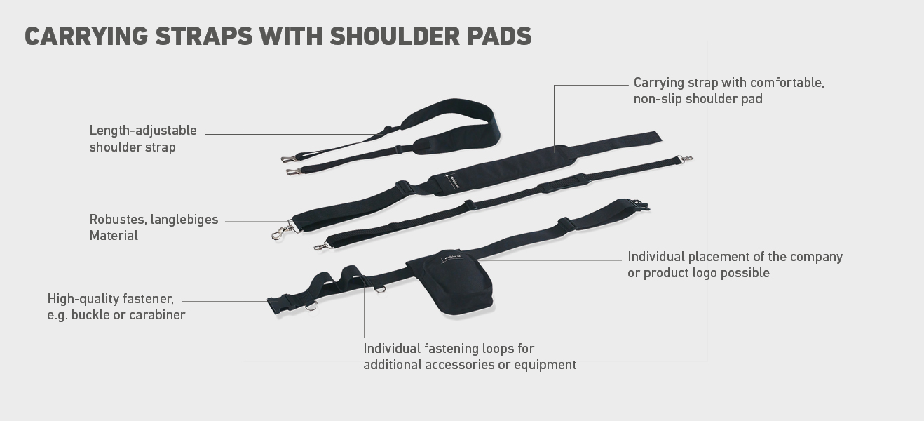 - Carrying straps, in many widths and all lengths, adjustable in length, with different snap hooks or fastening parts, with and without shoulder padding or anti-slip device