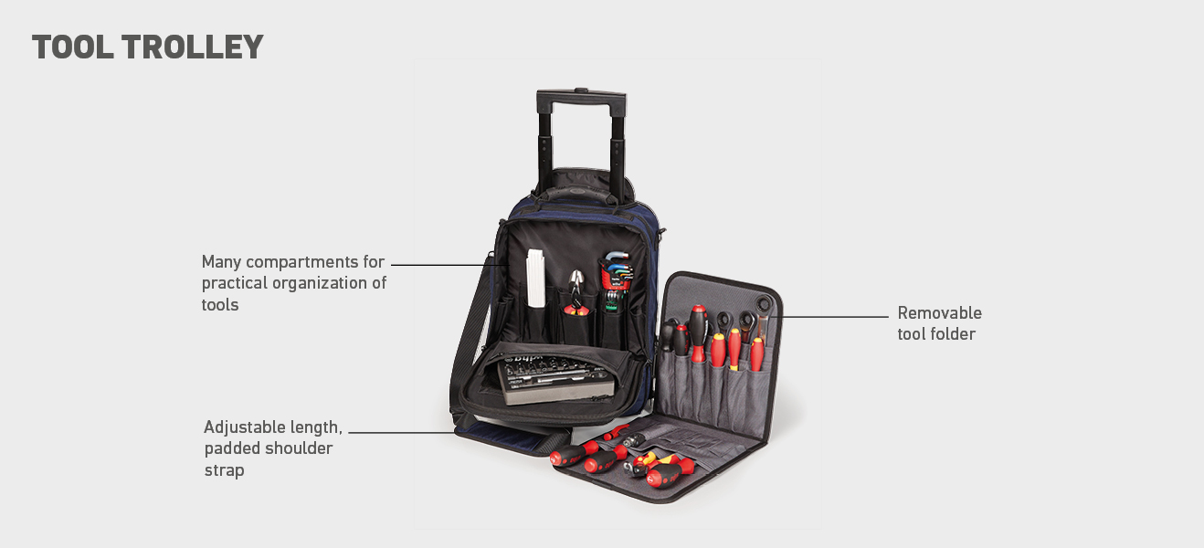 Cases as textile solutions protect the tools inside with panels and foams, provide stability and create good storage options. A typical example is the case for a drill or cordless screwdriver. - Tool bag systems